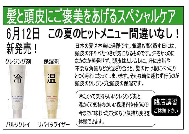 中野製薬から6月12日に発売されるフォリッジスキャルプトリートメントの立会いをさせていただきました。 ズバリ!体感効果抜群の頭皮エステメニューです。 モデルになったスタッフさんの声ですが、 バブルクレイ(クレンジング剤)は、冷たくてとても気持ちが良い リバイタライザー(保湿ジェル剤)は、温かくてとても気持ち良い 香りが心地よい...