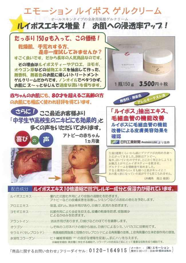 現在市場に出回っているゲルクリームとの違いはルイボスエキスを配合している点です。 保湿性に優れており、特に乾燥時期には違いを実感していただけます。 また、アレルギー肌、敏感肌の方にも安心してお使いいただけます。