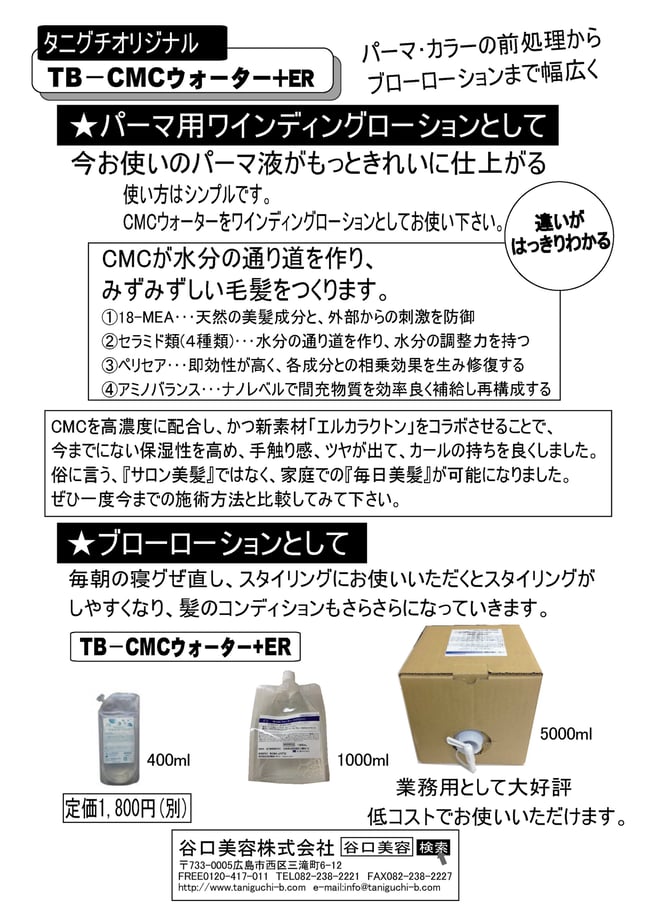 21日 1月 2013 当社がオリジナルで開発したCMCウォーターです。タンニンカール、パーマのワインディングローションとして、仕上げのベース剤としてお使い下さい。 tagPlaceholderカテゴリ: その他