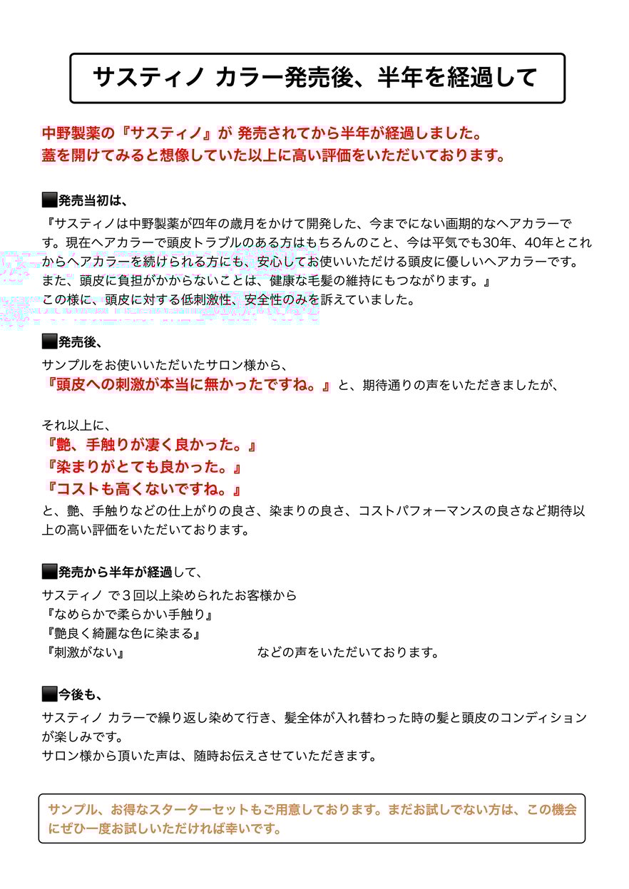 中野製薬サスティノカラー発売から半年を経過して、高い評価!